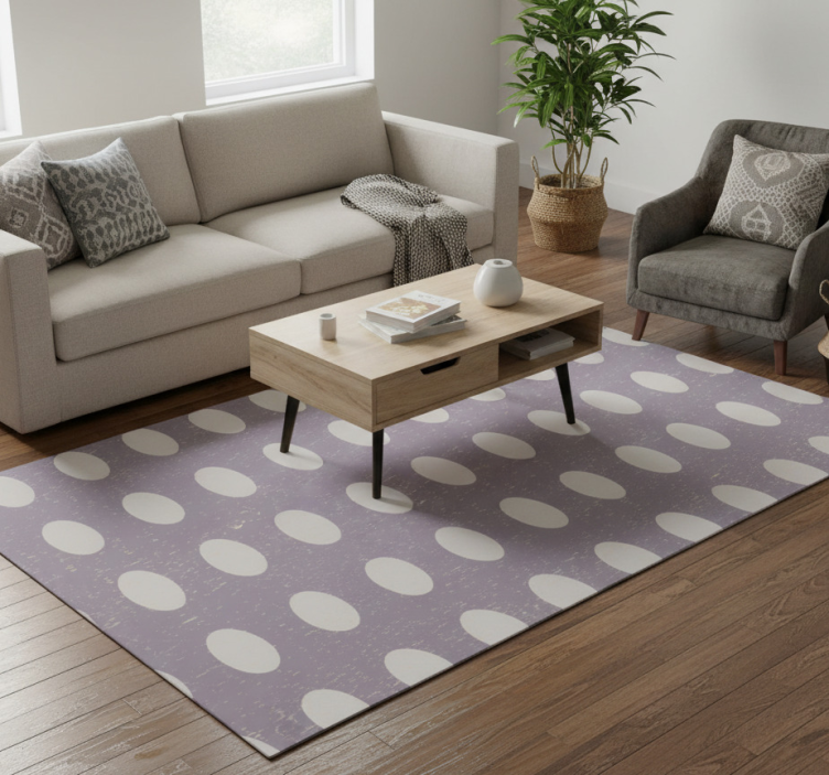 The Geometric vinyl rug in gray and purple circles showcases a stunning blend of modern design and vibrant colors, featuring an eye-catching geometric pattern that brings a lively ambiance to any space. With its unique combination of gray and purple circles, this rug serves as a perfect centerpiece, adding style and character to your home.
