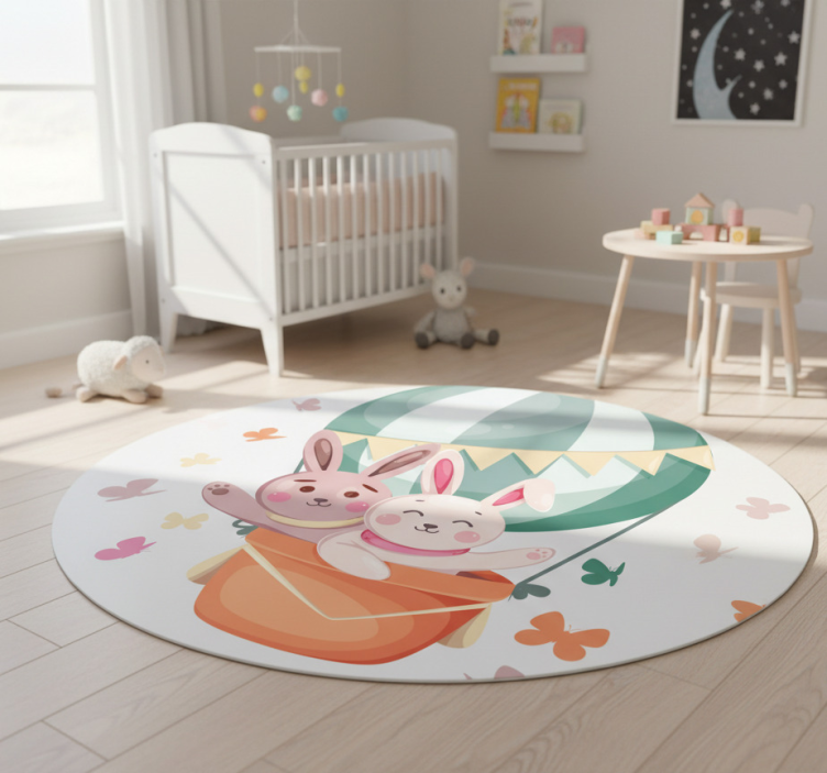 Kids vinyl rug with custom bunnies in balloons