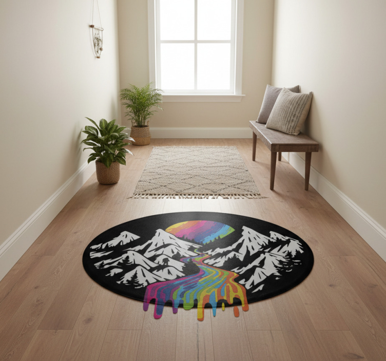 Reference: R21953Transform your living space with the Nature vinyl rug rainbow mountain landscape, a stunning piece that captures the essence of serene mountain vistas and vibrant rainbows. This beautiful design boasts an array of colors that breathe life into any room, showcasing the breathtaking beauty of nature. Its graphic representation invites a sense of peace and tranquility, making it a perfect focal point for your home decor!