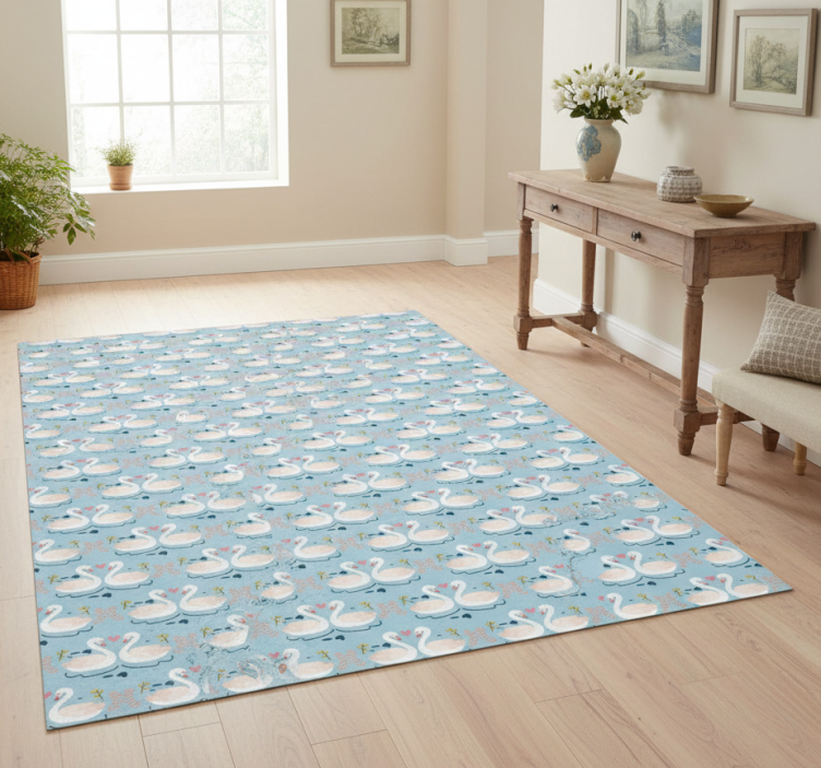 Caring for your Nature vinyl rug with swans in love on blue nature vinyl rug is a breeze! Simply wipe it with a damp cloth or use a gentle cleaner to maintain its vibrant colors and patterns. Regular cleaning will keep it looking fresh and inviting, allowing you to enjoy its beauty for years to come!
