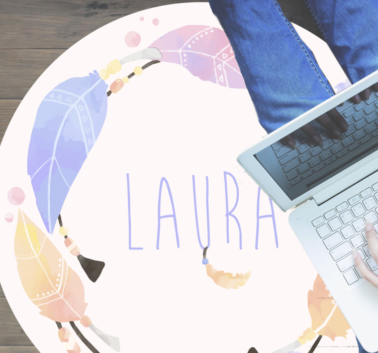 The Personalized Feather Circle custom vinyl rug features a stunning design with delicate watercolor feathers in pastel colors, making it a perfect addition to any bohemian-inspired space. Each rug is custom-made with your name, adding a unique and personal touch to your home decor!