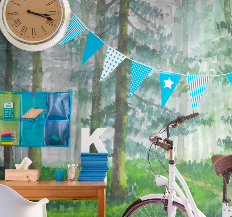 Transform your space with our stunning Forest wall mural forest pathway detail. This captivating design features a beautiful painting that immerses you in a tranquil forest scene, complete with lush trees and a winding path that beckons you to explore. The nordic style illustration captures the essence of nature, with vibrant green hues that bring a refreshing touch to any room!