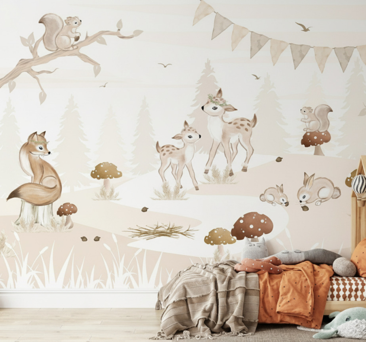 Reference: F11906Transform your child's space into a dreamy escape with our Forest wall mural whimsical woodland nursery. This enchanting design features a serene forest landscape adorned with playful woodland creatures, lush trees, and soft, inviting colors that create a calming atmosphere. The matt finish enhances the whimsical charm, making it a perfect backdrop for your little one's adventures!