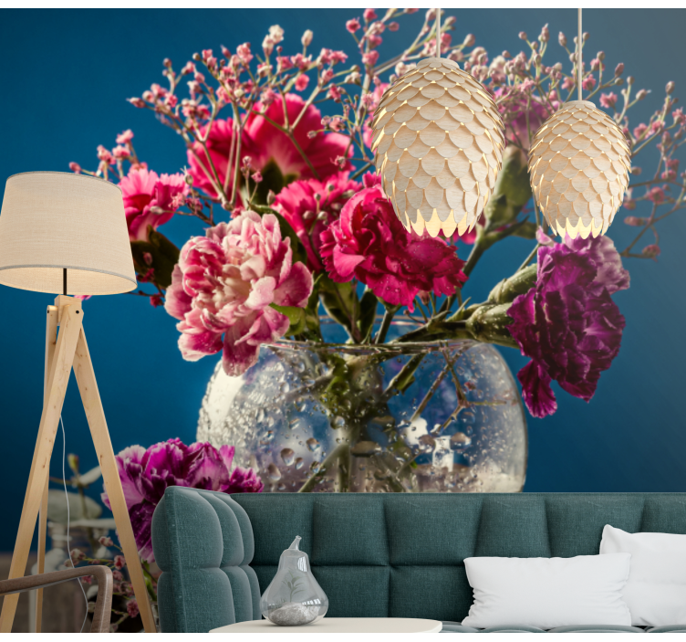 Transform your space with the stunning Lively bloom composition flower wall mural. This exquisite design showcases a beautiful arrangement of clove flowers, vibrant carnations, and delicate flora that come together in a mesmerizing composition reminiscent of a vase filled with nature's finest blooms. With droplets of water adding a refreshing touch, this mural creates an inviting atmosphere that brings life to any room!