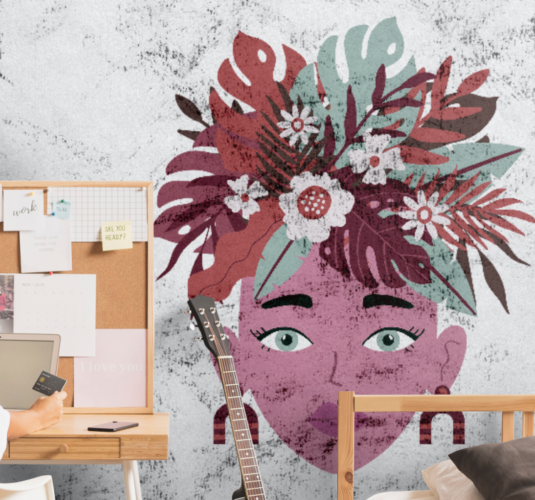 Transform your space with our stunning People wall mural stylized floral head, featuring a captivating design that beautifully blends a woman's face adorned with a vibrant array of tropical flowers and lush leaves. This portrait-like mural offers a unique texture that brings an air of elegance and artistry to any room, creating a focal point that draws the eye and elevates your decor!