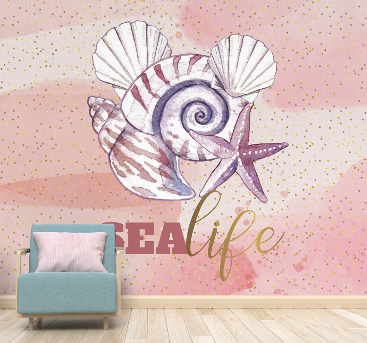 Under the sea wall mural of seashells and starfish