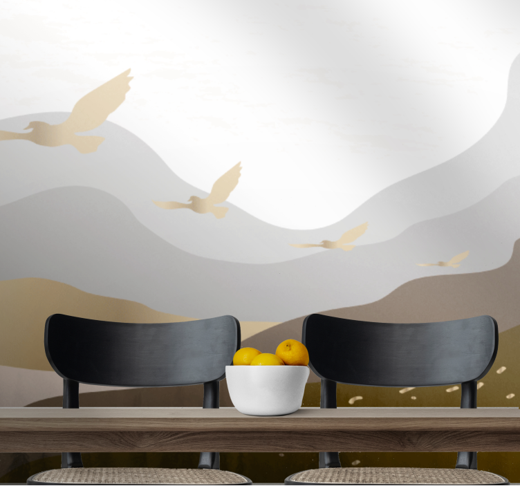 Transform your space with the stunning Wall mural nature flying birds silhouettes, where graceful birds soar against a backdrop of majestic mountains. This captivating illustration combines the beauty of nature with elegant silhouettes, creating a golden ambiance that uplifts any room!